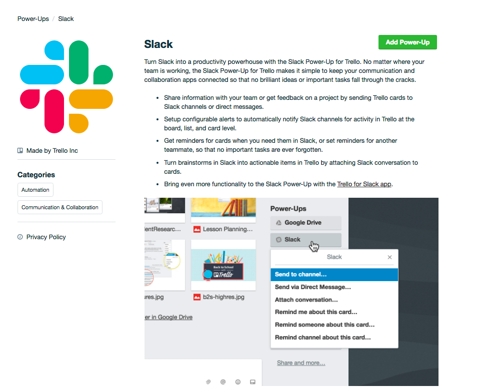 The Power-Up Directory is where Trello users go to discover and enable Power-Ups for their board needs. Make sure your listing (Overview and Description) clearly highlights the benefits and power that your Power-Up will bring to their Trello boards. Great Power-Up descriptions include images (and gifs!) of the Power-Up in action. For some examples, check out the GitHub, Harvest, and Droplr listings. Since the Power-Up Directory is indexed on Google, this is a great place to make a first impression!