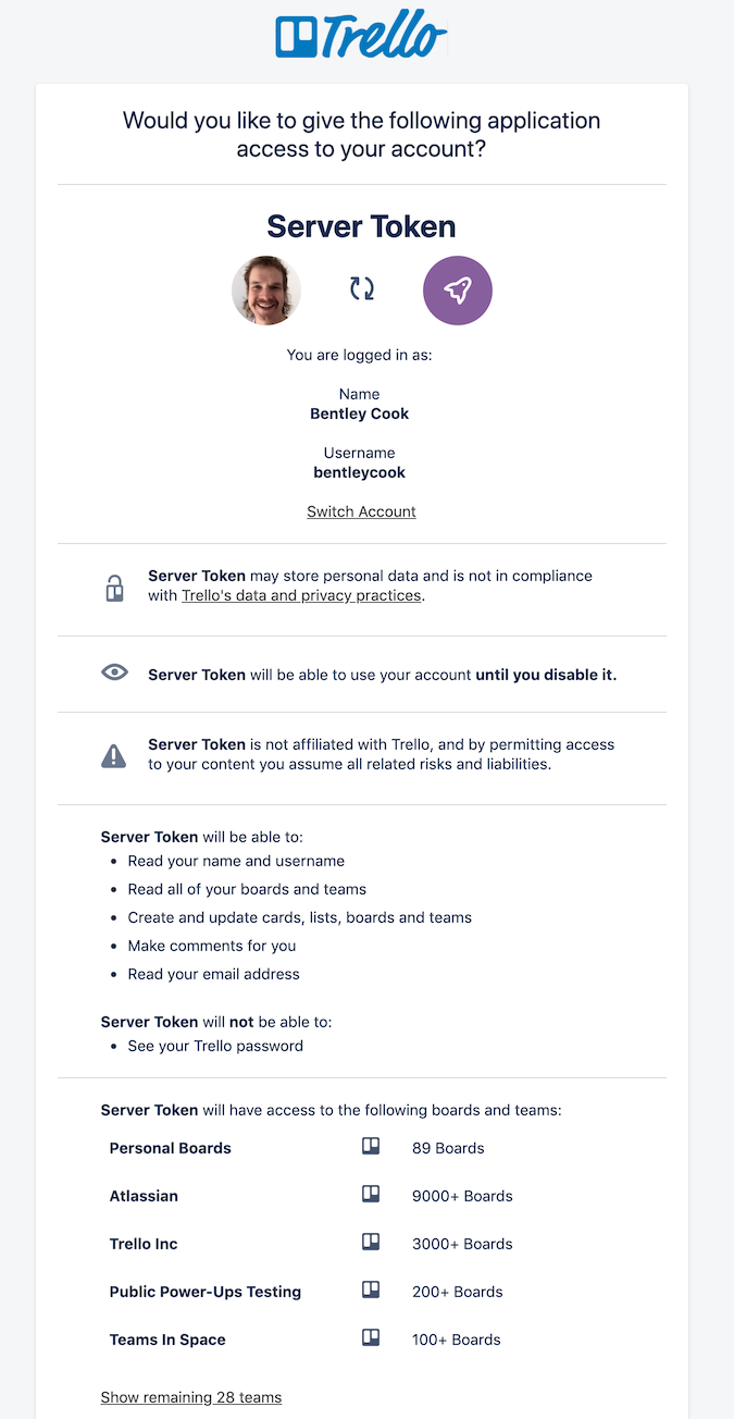 This token, along with your API key, can be used to read and write for your entire Trello account. Tokens should be kept secret!