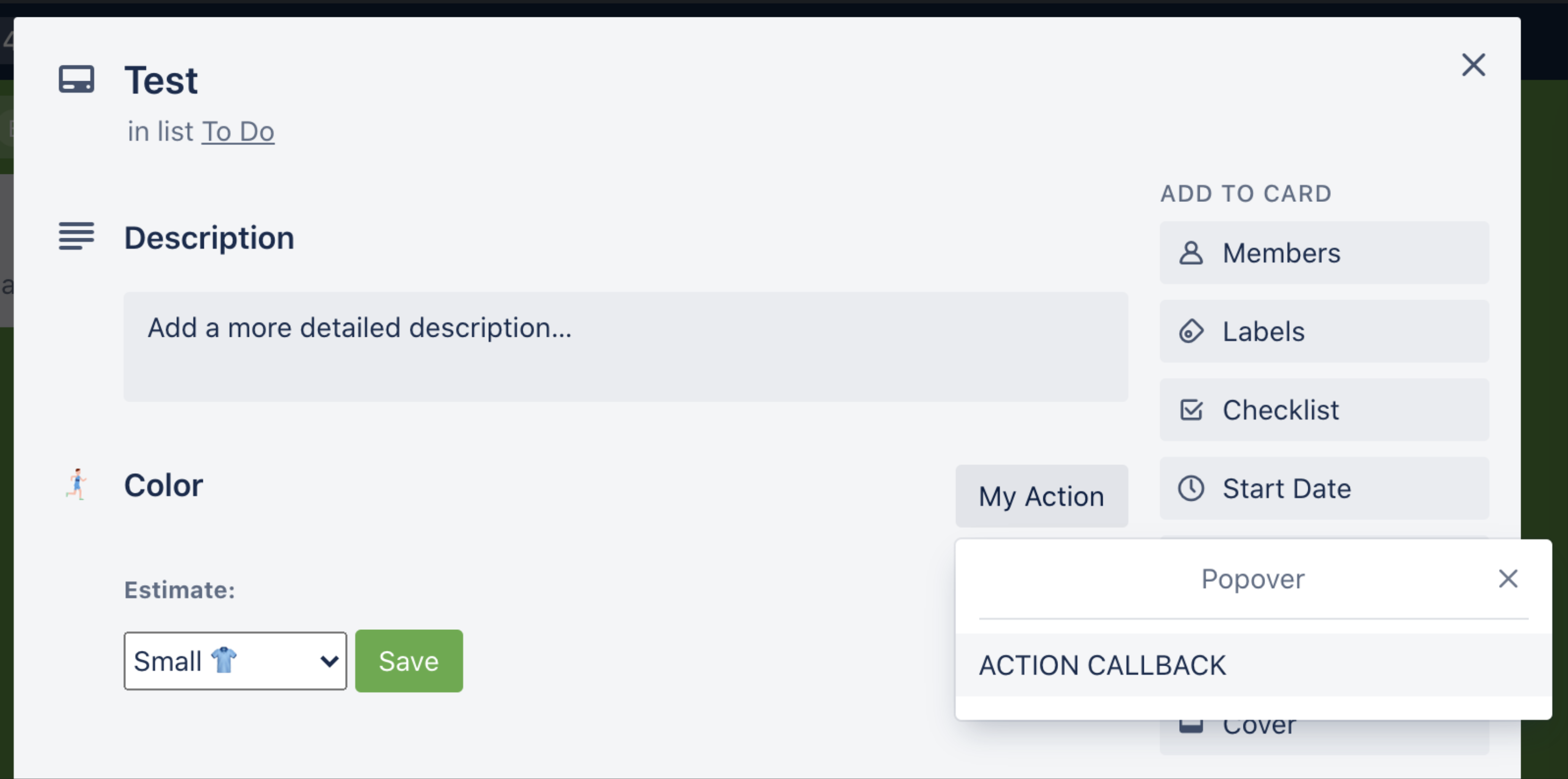 1 2var GRAY_ICON = 'https://cdn.hyperdev.com/us-east-1%3A3d31b21c-01a0-4da2-8827-4bc6e88b7618%2Ficon-gray.svg'; window.TrelloPowerUp.initialize({ 'card-back-section': function(t, options){ return { title: 'My Card Back Section', icon: GRAY_ICON, // Must be a gray icon, colored icons not allowed. content: { type: 'iframe', url: t.signUrl('./section.html'), height: 230, // Max height is 1500. }, action: { text: 'My Action', callback: (t) => t.popup(...), } }; } });