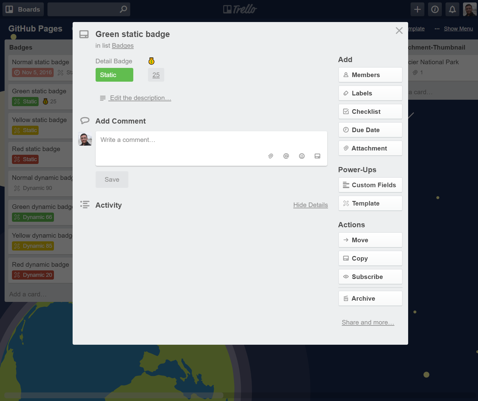 1 2window.TrelloPowerUp.initialize({ "card-detail-badges": function (t, opts) { return t .card("name") .get("name") .then(function (cardName) { console.log("We just loaded the card name for fun: " + cardName); return [ { // dynamic badges can have their function rerun after a set number // of seconds defined by refresh. Minimum of 10 seconds. dynamic: function () { // we could also return a Promise that resolves to this // as well if we needed to do something async first return { title: "Detail Badge", text: "Dynamic " + (Math.random() * 100).toFixed(0).toString(), color: randomBadgeColor(), refresh: 10, // in seconds }; }, }, { // its best to use static badges unless you need your badges // to refresh you can mix and match between static and dynamic title: "Detail Badge", text: "Static", color: null, }, { // card detail badges (those that appear on the back of cards) // also support callback functions so that you can open for example // open a popup on click title: "Popup Detail Badge", text: "Popup", callback: function (t, opts) { // function to run on click // do something }, }, { // or for simpler use cases you can also provide a url // when the user clicks on the card detail badge they will // go to a new tab at that url title: "URL Detail Badge", text: "URL", url: "https://trello.com/home", target: "Trello Landing Page", // optional target for above url }, ]; }); }, });