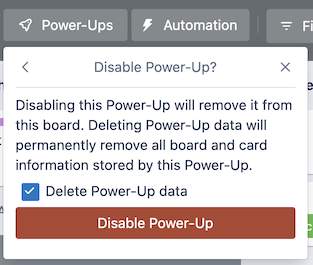 Note that board and workspace admins that disable Power-Ups from their board(s) may choose to clear the board-level storage for that Power-Up as a part of the disable action. This action clears all board-scoped and card-scoped Power-Up data that has a visibility of shared.