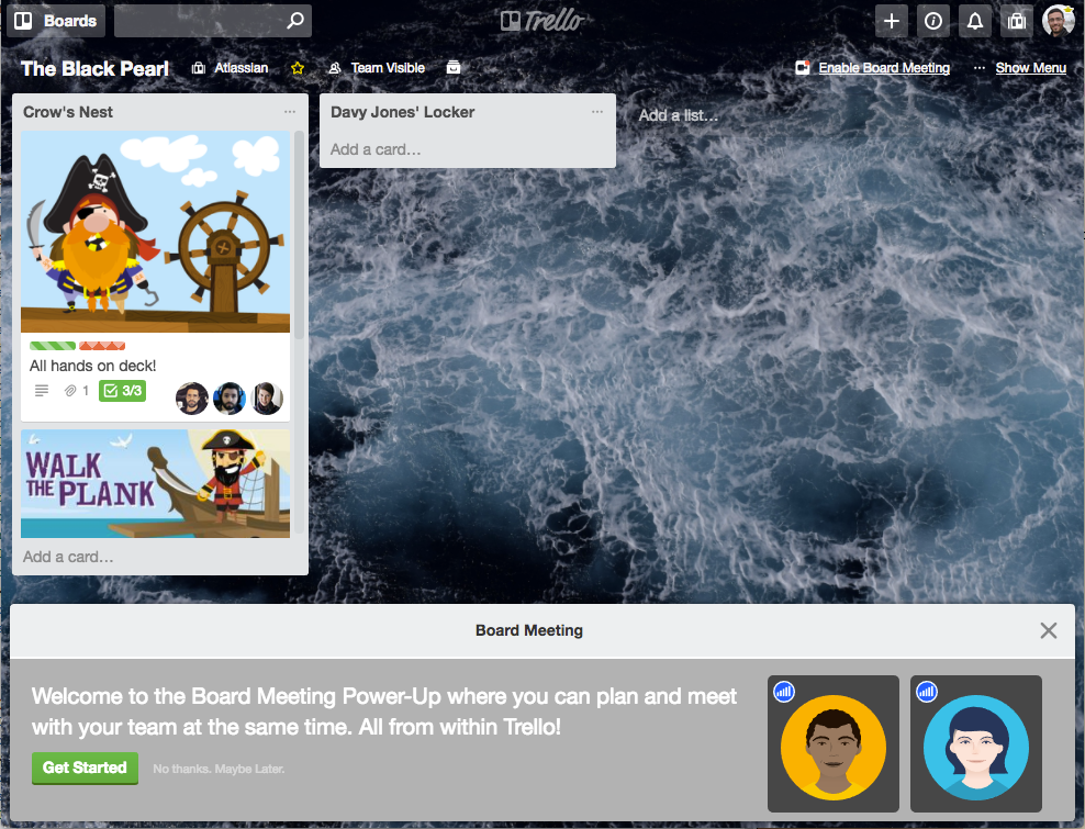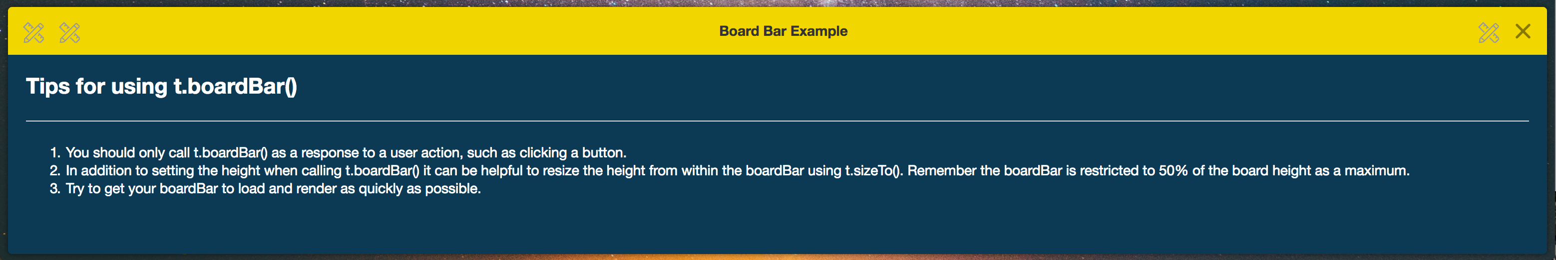 1 2window.TrelloPowerUp.initialize({ 'show-settings': function (t, opts) { return t.boardBar({ // required URL to load in the iframe url: './board-bar.html', // optional arguments to be passed to the iframe as query parameters // access later with t.arg('text') args: { text: 'Hello' }, // optional color for header chrome accentColor: '#F2D600', // initial height for iframe height: 200, // initial height for iframe // optional function to be called if user closes modal callback: () => console.log('Goodbye.'), // optional boolean for whether the user should // be allowed to resize the bar vertically resizable: true, // optional title for header chrome title: 'Board Meeting', // optional action buttons for header chrome // max 3, up to 1 on right side actions: [{ icon: './images/icon.svg', url: 'https://google.com', alt: 'Leftmost', position: 'left', }, { icon: './images/icon.svg', callback: (tr) => tr.popup({ title: tr.localizeKey('appear_in_settings'), url: 'settings.html', height: 164, }), alt: 'Second from left', position: 'left', }, { icon: './images/icon.svg', callback: () => console.log(':tada:'), alt: 'Right side', position: 'right', }], }); } });