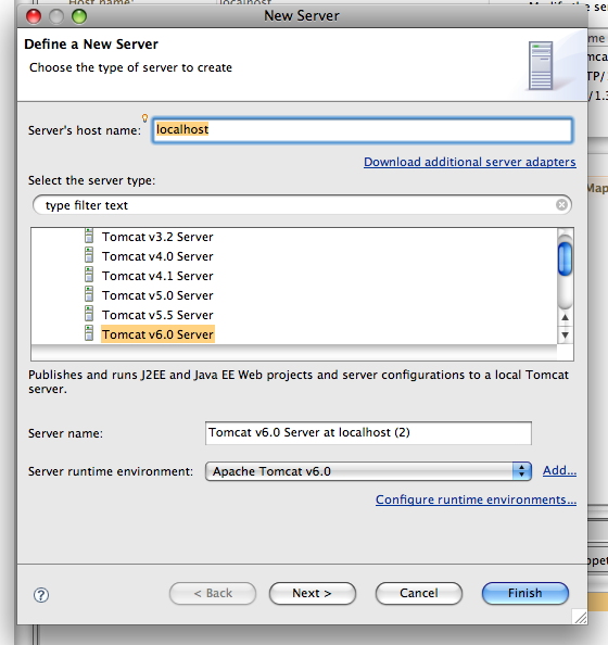 Click Next and the New Server wizard opens. This wizard defines a new server, that contains information required to point to a specific runtime environment for local or remote testing, or for publishing to an application server. By default, this field is pre-filled with the default address: localhost