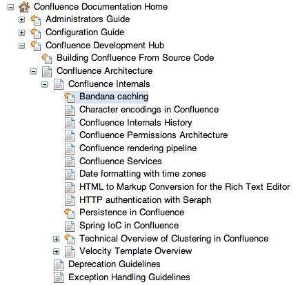 "Confluence Documentation Home", "Confluence Development Hub", "Confluence Architecture", "Confluence Internals". Note that the nodes are referenced by pageId and must be in the correct order - each node to expand must already be loaded. Once each node is expanded the callback function (if present) is executed. In this example, the callback highlights a node inside the expanded nodes - note that the "Bandana caching" node is only loaded from the server when the "Confluence Internals" node is expanded, so the highlighting must occur after this.