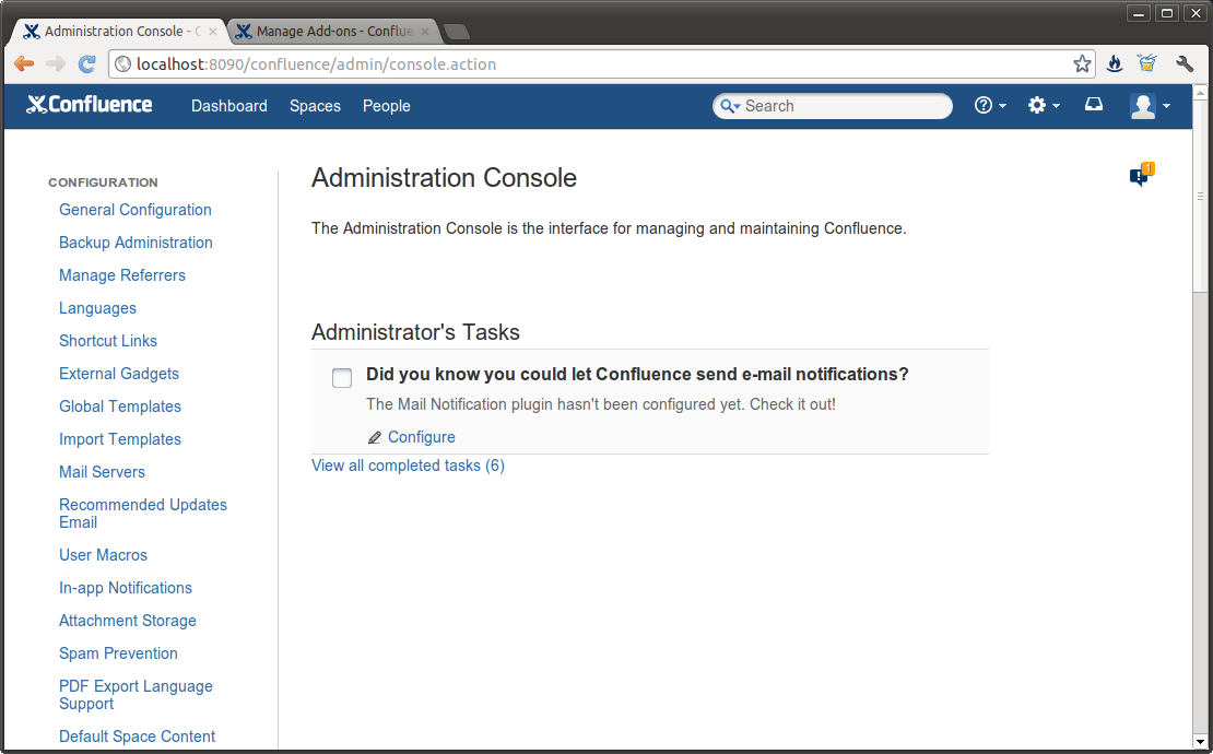 Plugins sometimes want to notify administrators about licenses, new features or alerts. UPM has a plugin point for post-install and post-update screens. When this is not enough, we've made Admin Tasks pluggable (CONF-23261). See Creating an Admin Task.