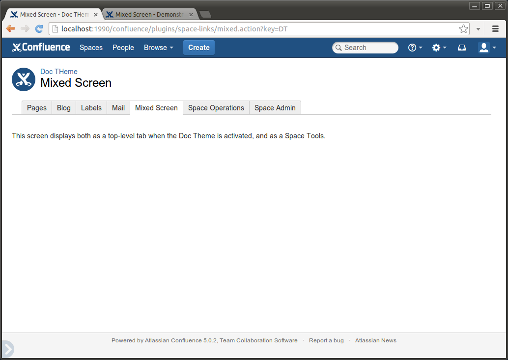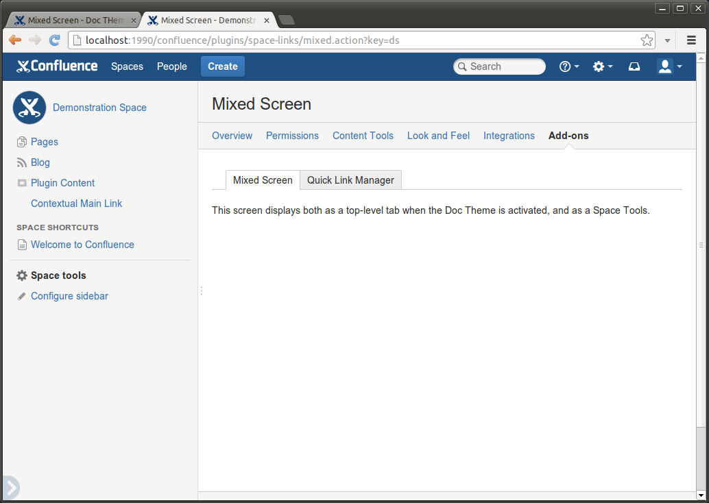 1 2<!-- Mixed Screen: Top-level Space tab in Doc Theme --> <web-item key="space-tab-link-for-mixed-screen" name="Top-level tab for the mixed screen" section="system.space" weight="50"> <label key="mixed.screen.title"/> <link id="mixed-screen-tab-id">/plugins/${project.artifactId}/mixed.action?key=$generalUtil.urlEncode($helper.spaceKey)</link> <condition class="com.atlassian.confluence.plugin.descriptor.web.conditions.SpaceSidebarCondition" invert="true"/> </web-item> <!-- Mixed Screen: Space Tools tab --> <web-item key="space-tools-link-for-mixed-screen" name="Space Tools tab for the mixed screen" section="system.space.tools/addons" weight="50"> <label key="mixed.screen.title"/> <link id="mixed-screen-space-tools-id">/plugins/${project.artifactId}/mixed.action?key=$generalUtil.urlEncode($helper.spaceKey)</link> </web-item>