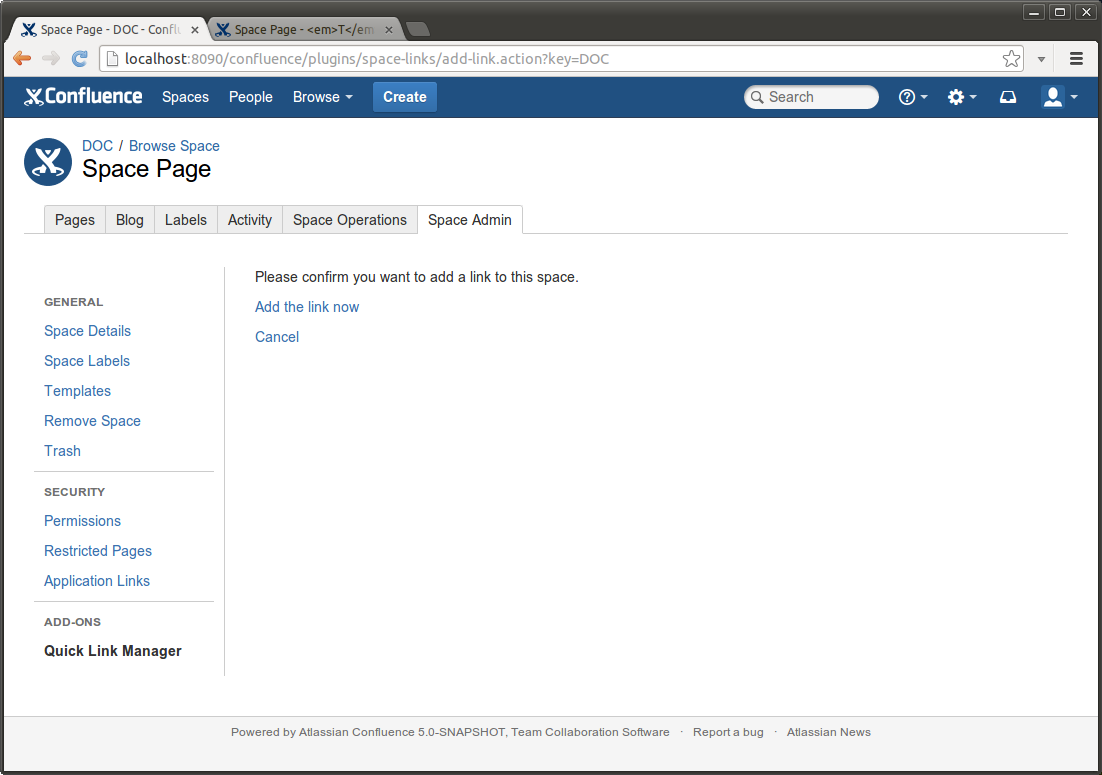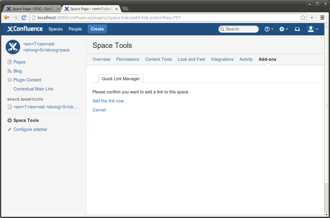 1 2<!-- Item in Space Tools --> <web-item key="space-admin-quick-link-manager" name="Quick Link Manager in Space Admin" section="system.space.tools/addons" weight="100"> <label key="space.admin.quick.link.manager" /> <link linkId="space-admin-quick-link-manager-id">/plugins/${project.artifactId}/add-link.action?key=$generalUtil.urlEncode($helper.spaceKey)</link> <conditions type="AND"> <condition class="com.atlassian.confluence.plugin.descriptor.web.conditions.SpacePermissionCondition"> <param name="permission">administer</param> </condition> <condition class="com.atlassian.confluence.plugin.descriptor.web.conditions.SpaceSidebarCondition"/> </conditions> </web-item> <!-- Item in Space Admin (for Doc Theme) --> <web-item key="space-admin-quick-link-manager-2" name="Quick Link Manager in Space Admin" section="system.space.admin/addons" weight="100"> <label key="space.admin.quick.link.manager" /> <link linkId="space-admin-quick-link-manager-id">/plugins/${project.artifactId}/add-link.action?key=$generalUtil.urlEncode($helper.spaceKey)</link> <conditions type="AND"> <condition class="com.atlassian.confluence.plugin.descriptor.web.conditions.SpacePermissionCondition"> <param name="permission">administer</param> </condition> <condition class="com.atlassian.confluence.plugin.descriptor.web.conditions.SpaceSidebarCondition" invert="true"/> </conditions> </web-item>