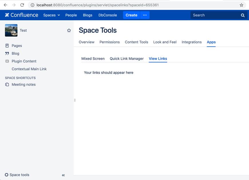 1 2<html> <head> <title>View links</title> <meta name="decorator" content="space.admin"/> <meta name="spaceid" content="$spaceId"/> <!-- Key of the web-item to highlight in Space Admin --> <content tag="space.admin.selected">space-admin-view-links-2</content> <!-- Key of the web-item to highlight in Space Tools --> <content tag="space.admin.tools.selected">space-admin-view-links/content> </head> <body> <div class="pagecontent"> <p>Your links should appear here</p> </div> </body> </html>