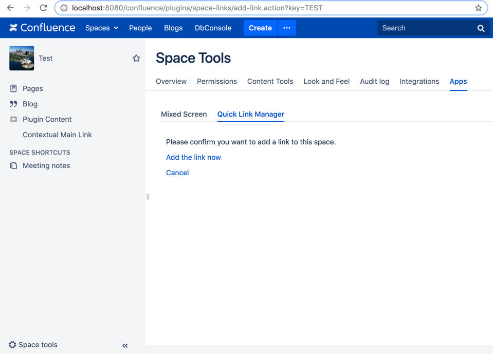 1 2<!-- Item in Space Tools --> <web-item key="space-admin-quick-link-manager" name="Quick Link Manager in Space Admin" section="system.space.tools/addons" weight="100"> <label key="space.admin.quick.link.manager" /> <link linkId="space-admin-quick-link-manager-id">/plugins/${project.artifactId}/add-link.action?key=$generalUtil.urlEncode($helper.spaceKey)</link> <condition class="com.atlassian.confluence.plugin.descriptor.web.conditions.SpaceSidebarCondition"/> </web-item>