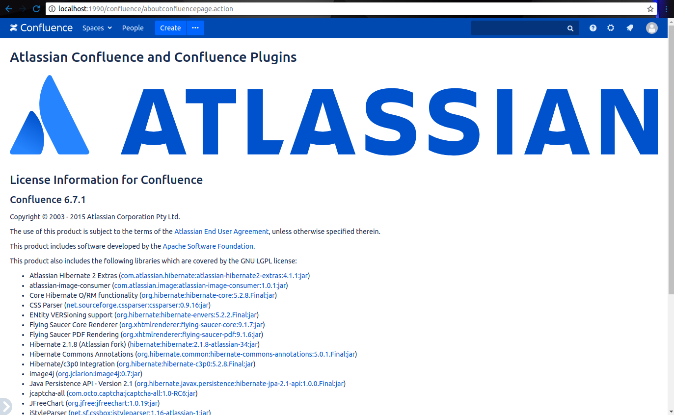 installation at http://locahost:1990/confluence, this will correspond to http://localhost:1990/confluence/aboutconfluencepage.action