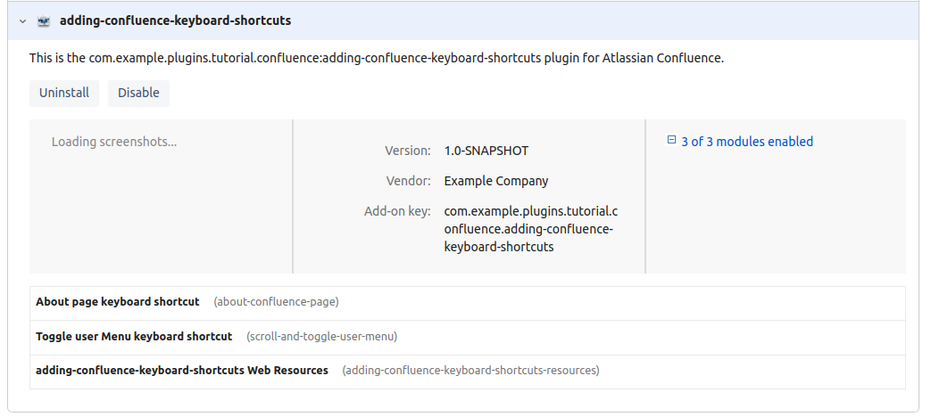 This tutorial shows you how to use a Keyboard shortcut module in your plugin to add keyboard shortcuts to different parts of the Confluence UI and navigation between pages. To do this, you create a very simple Confluence plugin consisting of the following components: