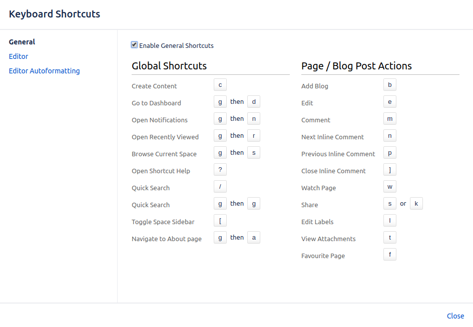 This plugin is designed to show two ways of adding new keyboard shortcuts to Confluence: