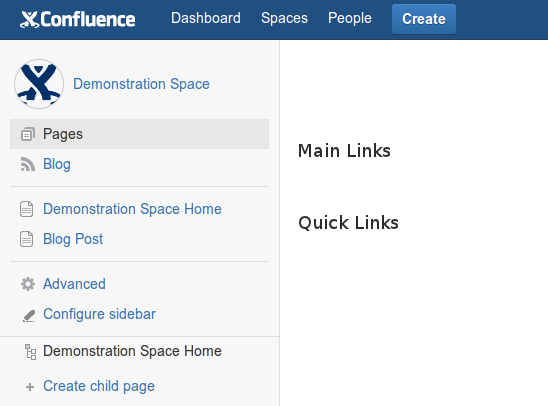 If you have followed the Create content plugin, your users can now open the Create dialog to insert a new page. Content of the same type is grouped in a collector. A link to the collector is created automatically in the space sidebar. This is called a "Space Shortcut Link" or "Quick Link".