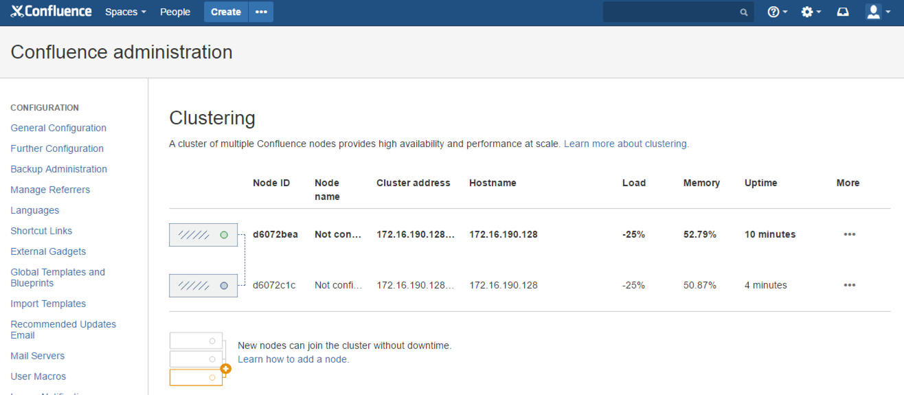 IPv6 support was added in Confluence 6.9. For earlier versions you need to start each server with the system property: -Djava.net.preferIPv4Stack=true