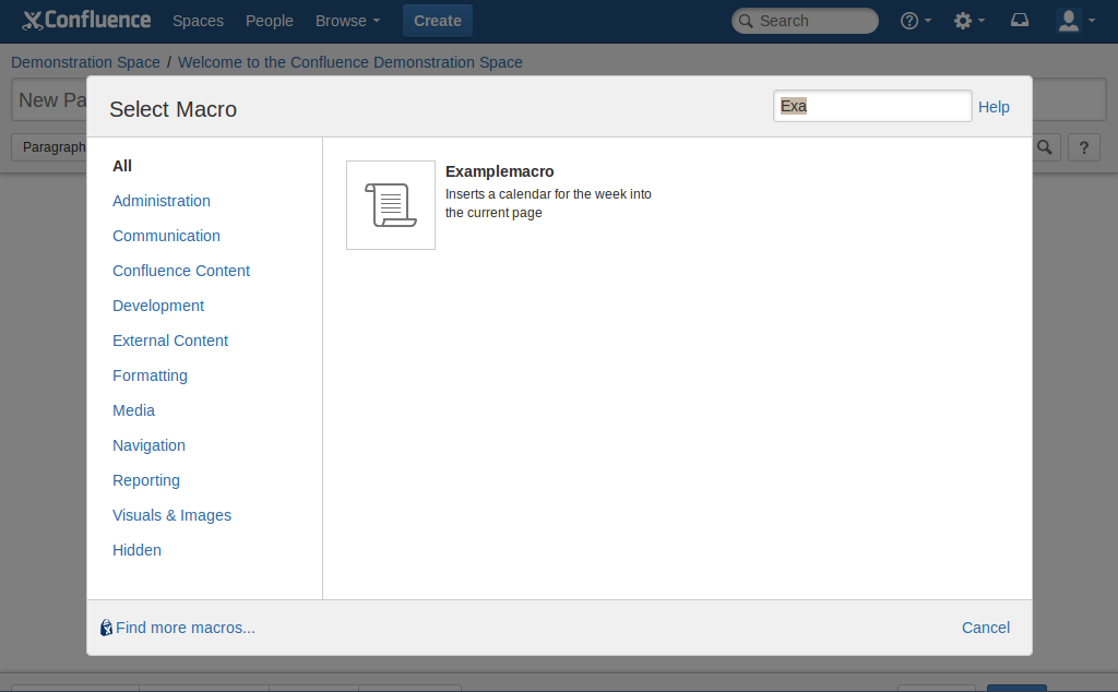 Create a file named ExampleMacro.java. in the src/main/java/com/example/plugins/tutorial/confluence directory.