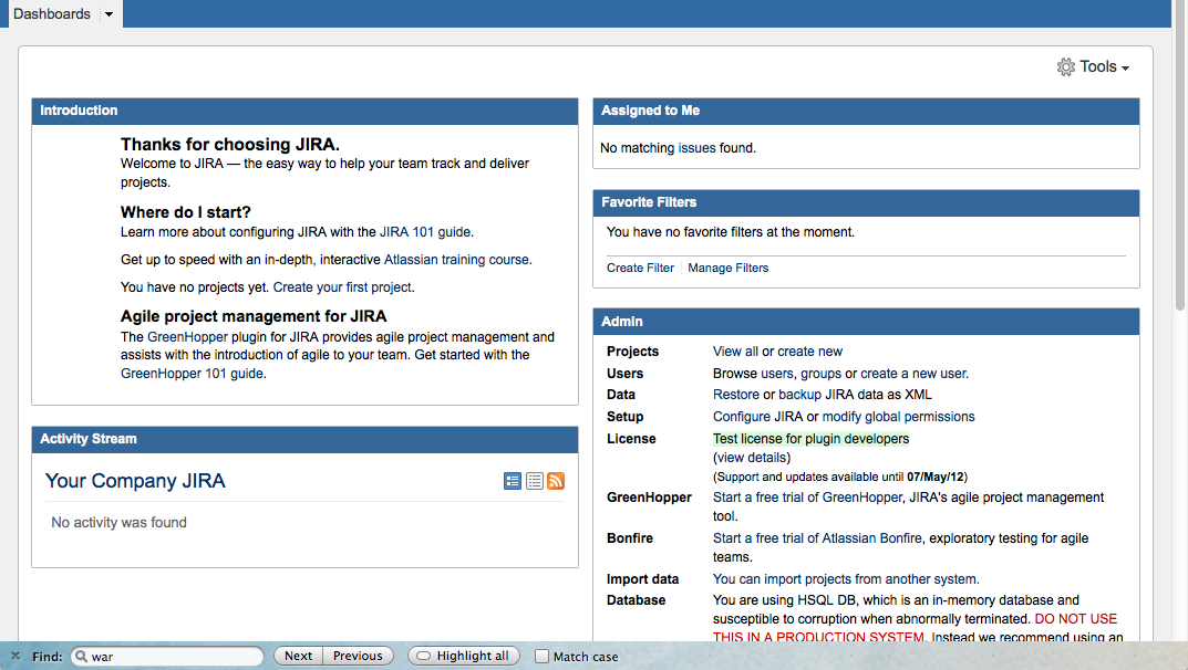 amps-standalone/target in the current atlastutorial directoryThe amps-standalone/target/jira-5.0.log file contains the details such as the environment variables set and used during this process. You'll notice from this log file that the JIRA test instance relies on an HSQL database. You would never use an HSQL database in a production system.