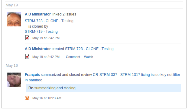 Atlassian Activity Streams displays 'activities', which are items that represent recently occurring events. Example events are the creation of a Crucible review or the transition of a JIRA issue. The stream is created from the input of 'providers' that create sets of items. This screenshot shows what part of an activity stream looks like, displayed within a JIRA gadget: