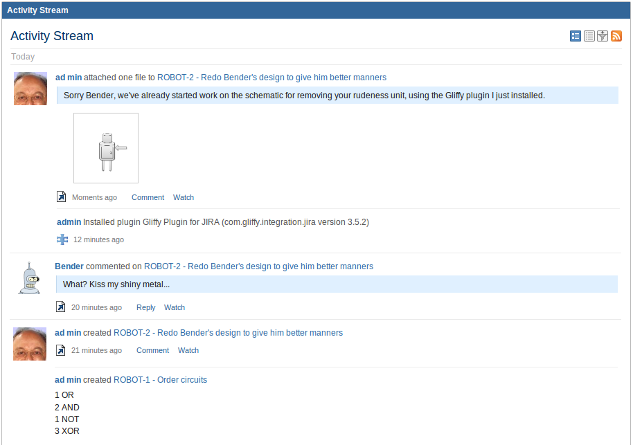 The sample plugin adds entries from the UPM (Universal Plugin Manager) audit log to the stream, in this case the installation of the Gliffy plugin to help create robot designs: