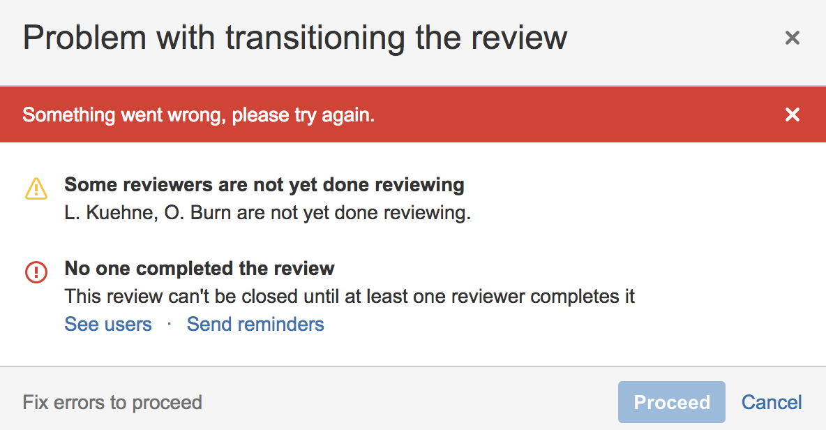 1 2$ curl -u admin:admin -X POST http://localhost:3990/fecru/rest-service/reviews-v1/CR-2/transition.json\?action\=action:closeReview { "reviewId": "CR-2", "message": "Some of workflow validation conditions have failed", "failedConditions": [ { "resultKey": "CompletedReviewerWorkflowCondition", "message": "This review can't be closed until at least one reviewer completes it", "severity":"error" } ] }