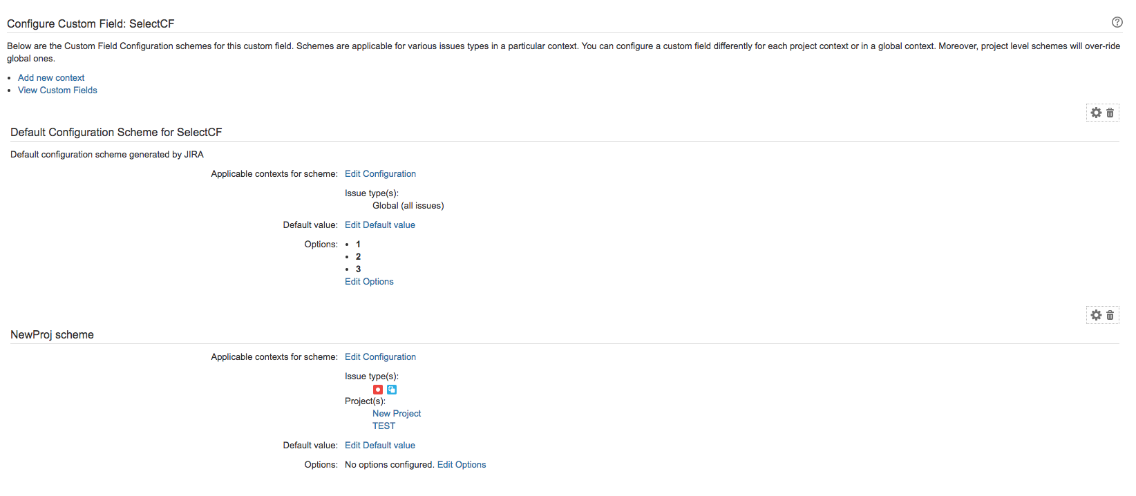 For instance, in this screenshot the "SelectCF" select-list field will have values 1, 2, 3 for all projects except bugs and sub-tasks in "NewProj" and "Test Project", which will have values A, B, and C:
