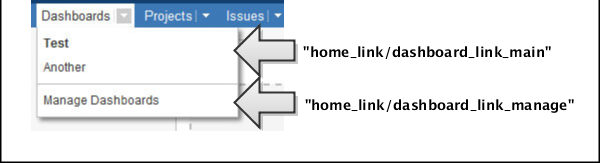 linkId attribute's value specified in the web item module for the drop-down menu (defined in the Jira source code), followed immediately by/, followed immediately bykey attribute's value specified in the relevant web section module (again found in the Jira source code).For example, if you wanted to add a web item to the 'Dashboard' drop-down menu, the following diagram shows what values you would use for the section attribute of this web item, based on the web section of the drop-down menu.