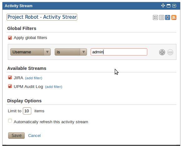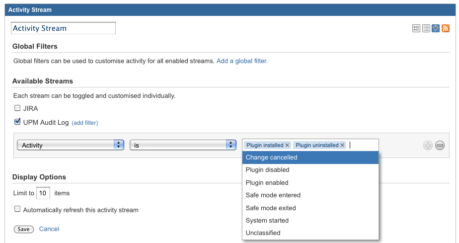 Additionally, if you specify filters in your implementation of StreamsFilterOptionProvider, you can have your own provider-specific Activity Streams filters. The sample plugin includes filters for various kinds of plugin activity.