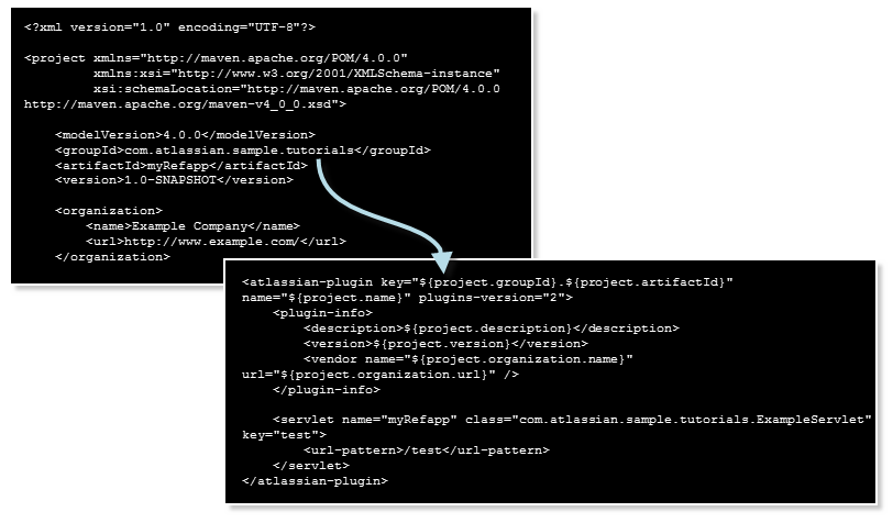 Instead of duplicating the values in both files, the Atlassian SDK uses the Maven filtering utility. The utility keeps common values synchronized, so you don't have to add or modify the properties in two places. You only need to change the value in the POM file to have it propagated to the plugin descriptor at compilation time.