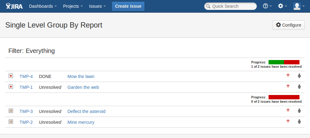 available in a given Jira instance are retrieved through Jira filterprojectpicker facility.startDate — sets the start of the time period included in the report.endDate — sets the end of the time period in the report.interval — specifies the time interval used to divide the overall time period. In other words, this is the histogram interval.So far we've been working on two modules at once, each of them corresponds to separate reports in Jira. Now let's take them one at a time, starting with the Single Level Group By Report Extended.