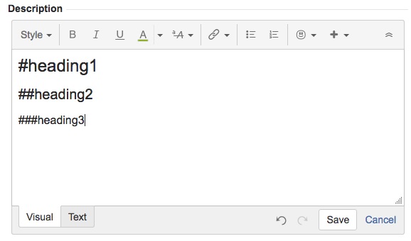 If you've read these two tutorials: Tutorial - Writing plugin for Rich Text Editor in JIRA and Tutorial - Customizing Rich Text Editor in JIRA, you'll know how to add new functionality to the Rich Text Editor. After reading this tutorial, you'll know how to customize settings in underlying TinyMCE editor. Let's assume you want to allow typing markdown-like headings. The end result: