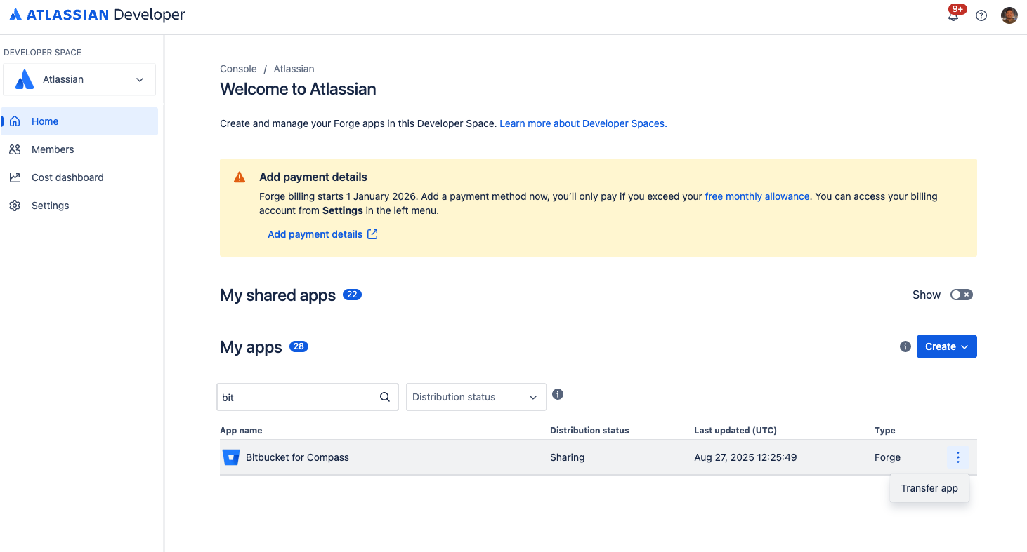 Developer Spaces are required for building, managing, and billing Forge apps. All apps, including Marketplace and private apps, must be assigned to a Developer Space. This page explains how to view, assign, create, and transfer apps within Developer Spaces.
