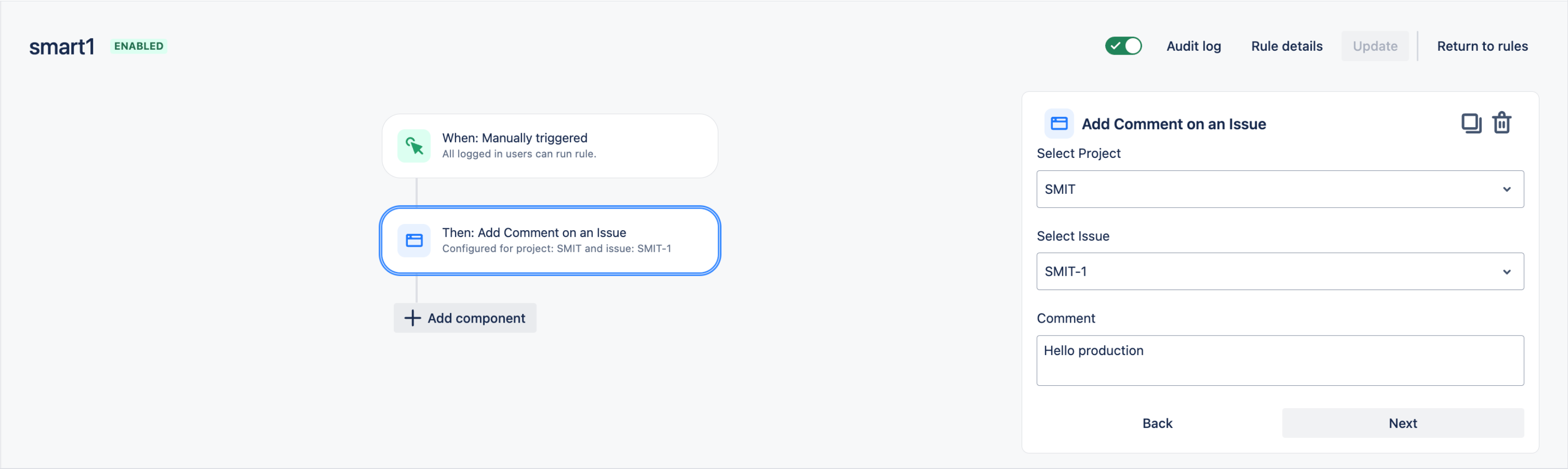When a user adds your action to a rule, they configure it through your custom form. When the rule executes, Automation invokes your Forge function with the configured inputs. Your action can then: