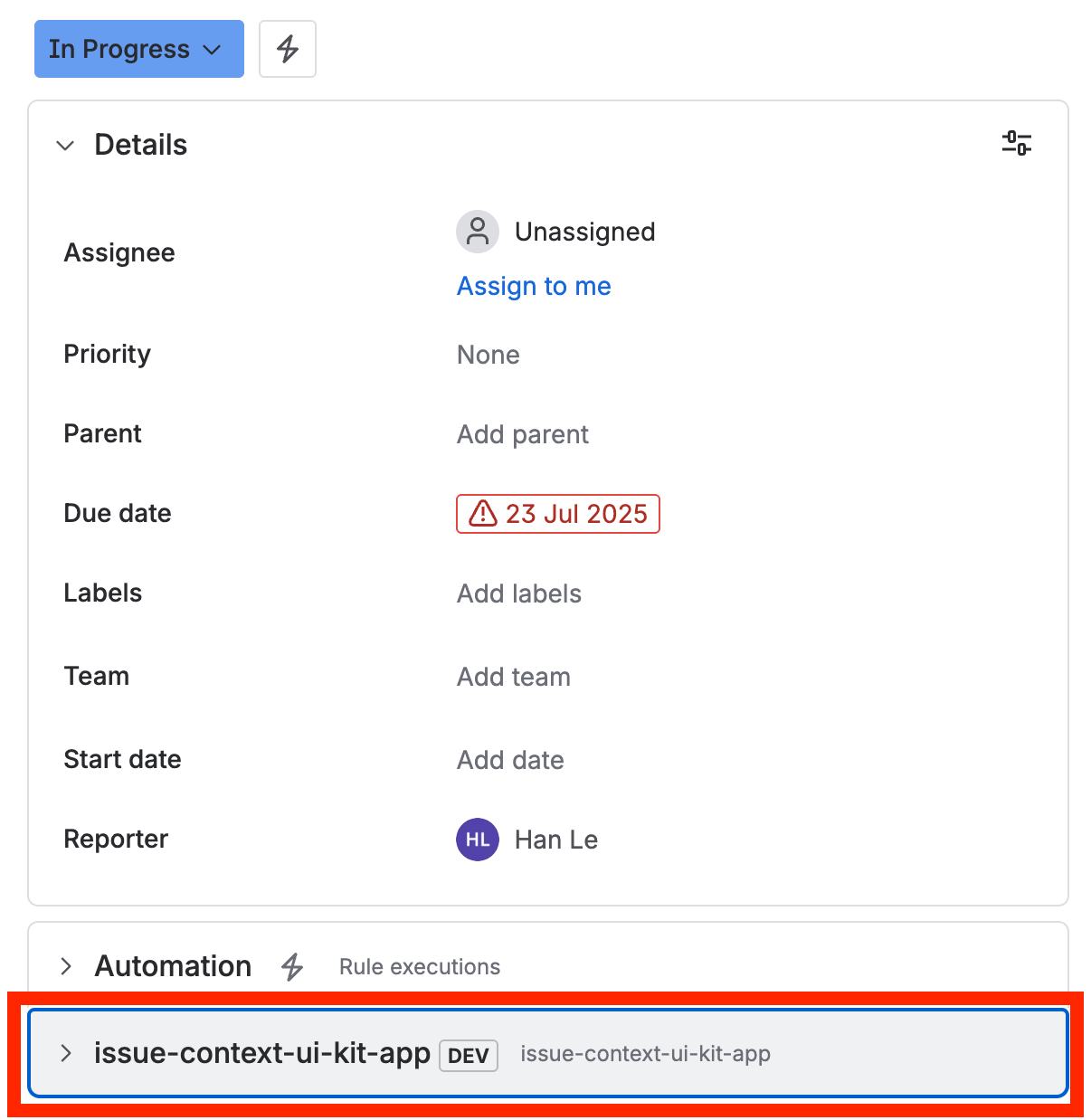 1 2modules: jira:issueContext: - key: hello-world-issue-context resource: main resolver: function: resolver render: native title: Hello World! description: A hello world issue context. label: Hello World!