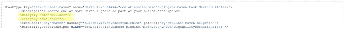 1 2<taskType key="task.builder.maven" name="Maven 1.x" class="com.atlassian.bamboo.plugins.maven.task.Maven1BuildTask"> <description>Execute one or more Maven 1 goals as part of your build</description> <category name="builder"/> <category name="test"/> <executable key="maven" nameKey="builder.maven.executableName" pathHelpKey="builder.maven.helpPath"/> <capabilityDefaultsHelper class="com.atlassian.bamboo.plugins.maven.task.Maven1CapabilityDefaultsHelper"/> <configuration class="com.atlassian.bamboo.plugins.maven.task.configuration.Maven1BuildTaskConfigurator" /> <resource type="freemarker" name="edit" location="com/atlassian/bamboo/plugins/maven/task/configuration/maven1BuildTaskEdit.ftl"/> <resource type="freemarker" name="view" location="com/atlassian/bamboo/plugins/maven/task/configuration/maven1BuildTaskView.ftl"/> </taskType>
