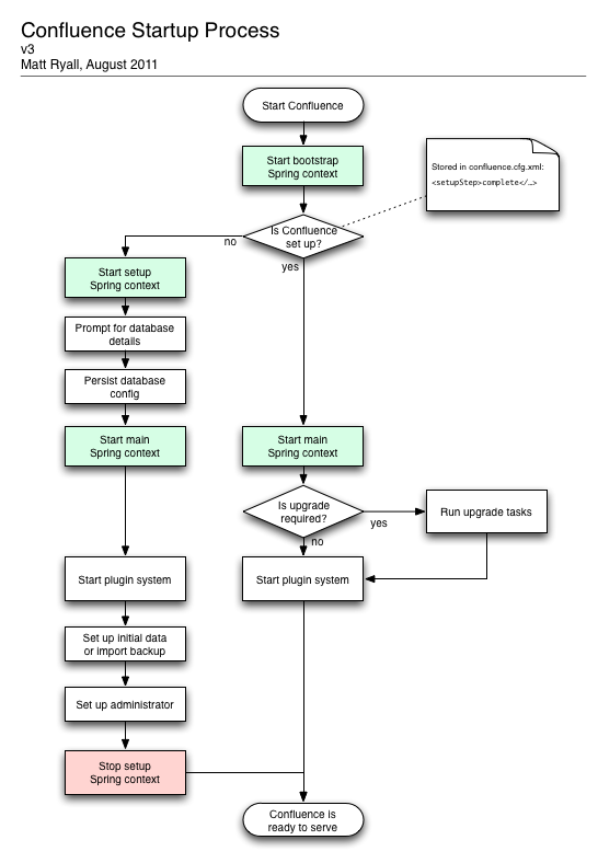 The start-up (also called "bootstrap") process for Confluence is quite intimidating and can be fragile when changes are made to it. It helps to have an overview of what is happening across the entire process.