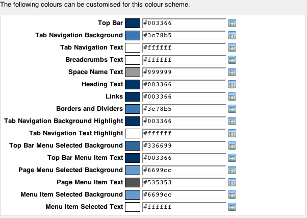1 2<theme key="mytheme" .... > ... <colour-scheme key="com.atlassian.confluence.themes.mytheme:earth-colours"/> ... </theme> ... <colour-scheme key="earth-colours" name="Brown and Red Earth Colours" class="com.atlassian.confluence.themes.BaseColourScheme"> <colour key="property.style.topbarcolour" value="#440000"/> <colour key="property.style.spacenamecolour" value="#999999"/> <colour key="property.style.headingtextcolour" value="#663300"/> <colour key="property.style.linkcolour" value="#663300"/> <colour key="property.style.bordercolour" value="#440000"/> <colour key="property.style.navbgcolour" value="#663300"/> <colour key="property.style.navtextcolour" value="#ffffff"/> <colour key="property.style.navselectedbgcolour" value="#440000"/> <colour key="property.style.navselectedtextcolour" value="#ffffff"/> </colour-scheme>