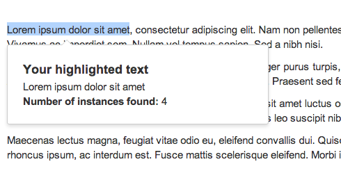 In this tutorial you will extend the highlight actions panel to add a button that shows the number of times the highlighted text appears on the page.