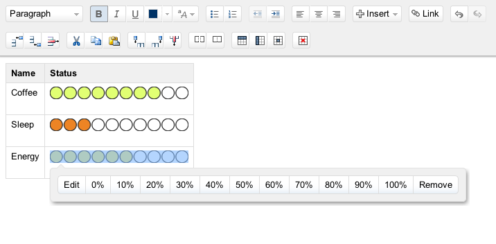 We are going to create a status light macro that will render in the editor with additional buttons in the property panel to change the current status - from 0 to 100 percent.