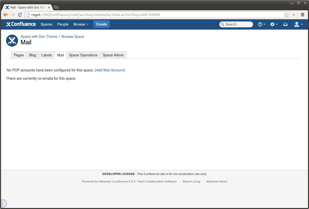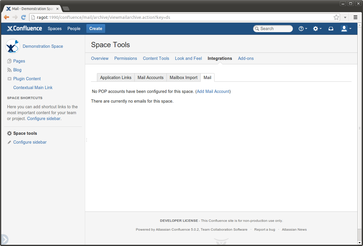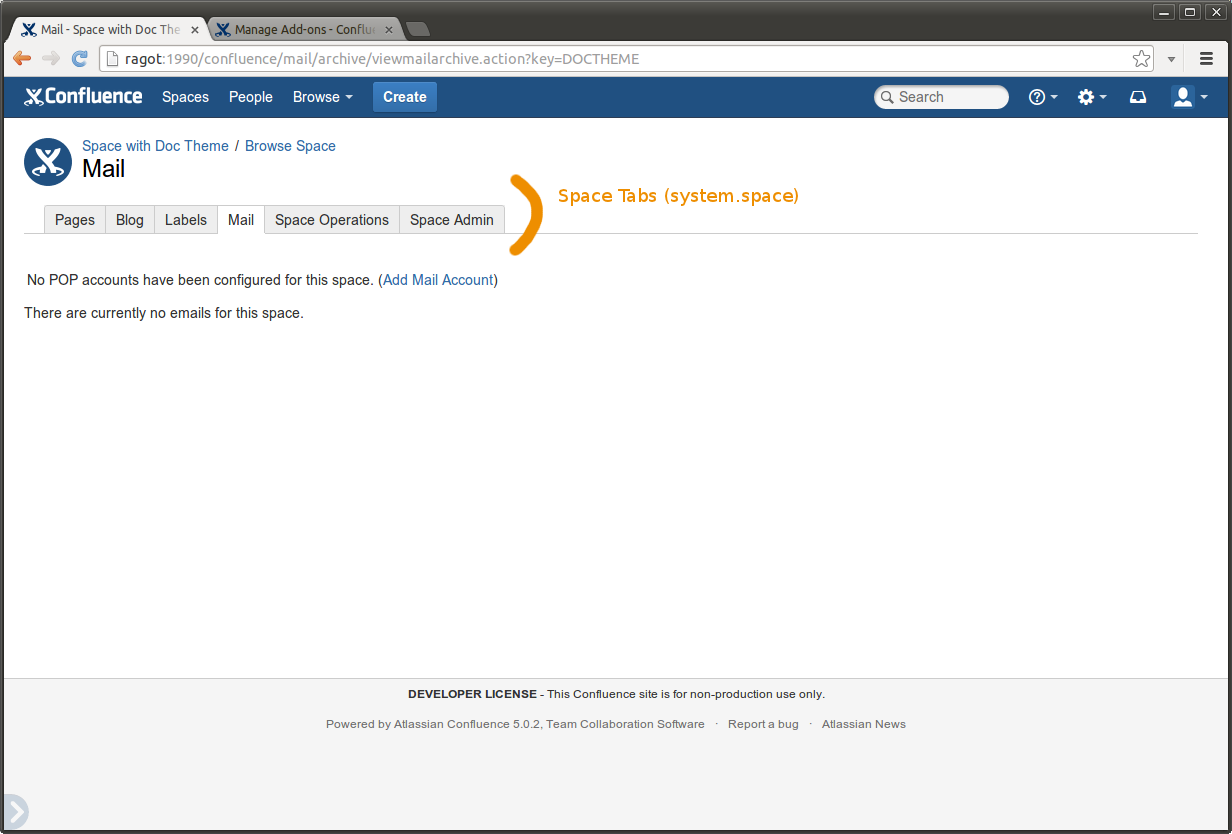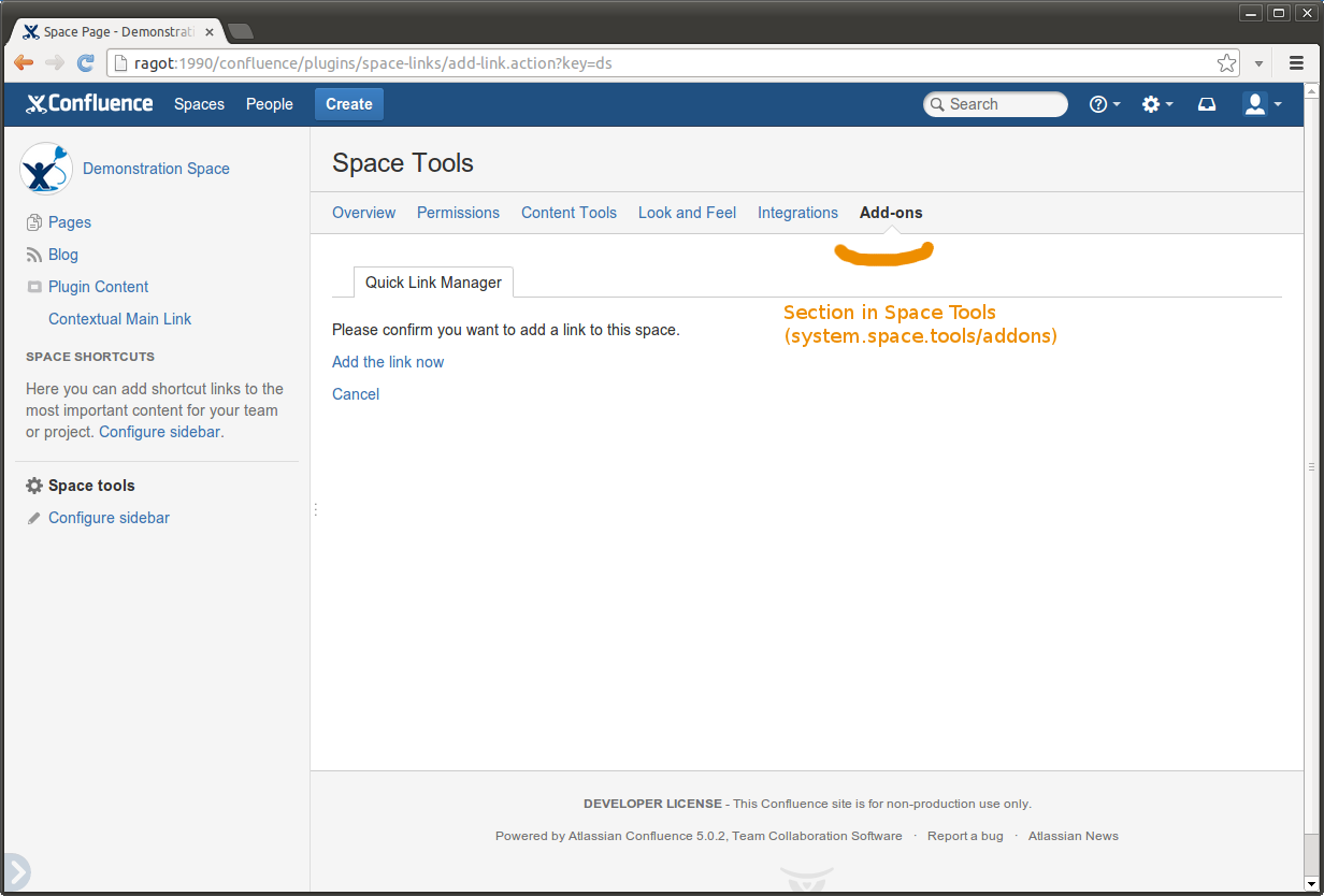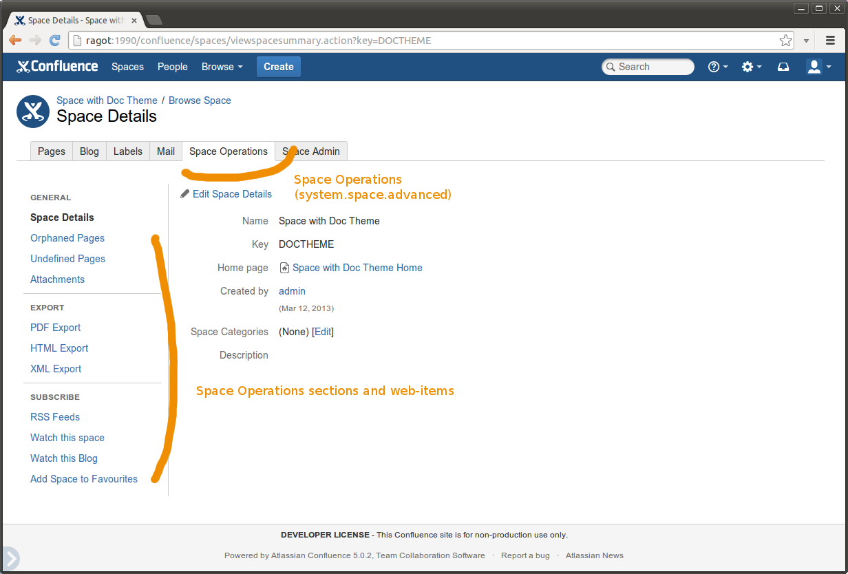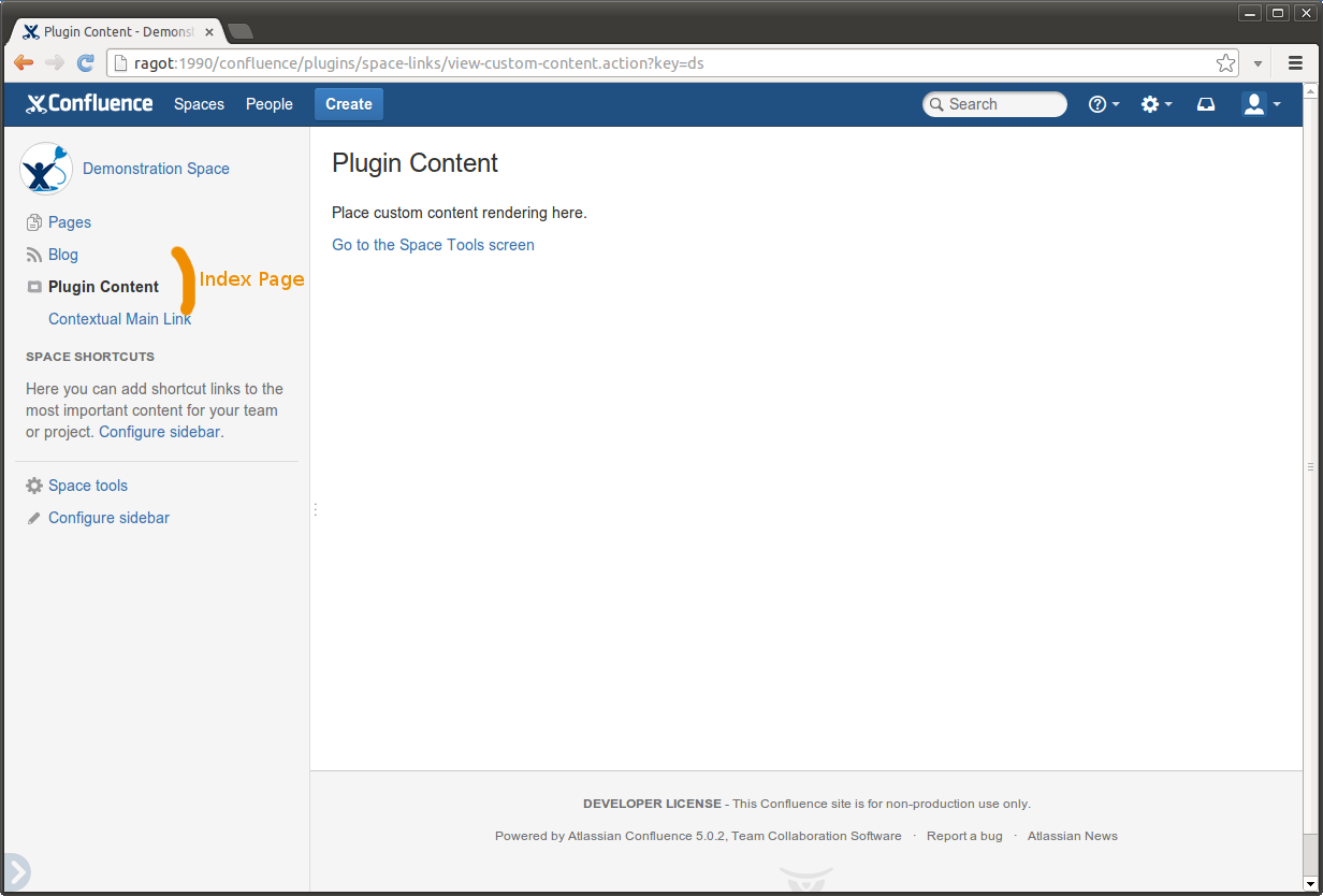 Plugin options are displayed as a Space Admin screen (or Space Operations if options should be available to all users) and as a Space Tools in the 5.0 Theme.