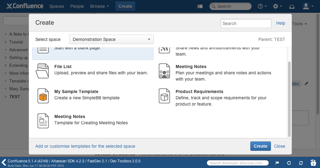 In this tutorial, you will learn how to create a very simple blueprint plugin (without writing any Java classes) that can be installed only on Confluence Data Center. To create a blueprint for Confluence Cloud go to Multi-page blueprints with Confluence Connect.