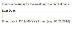 In this tutorial, you create a Confluence macro that prints out the days of the week starting on a given date. If a user supplies a date as a macro parameter, the macro prints the days of the week starting on that date. Otherwise, it shows the the days of the week starting with the current date.