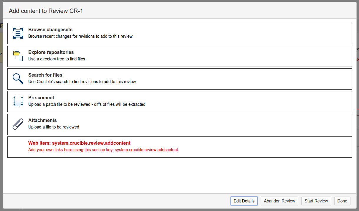 Key: system.crucible.review.addcontent Description: Adds a link to the 'Add content' dialog on the review screen (Crucible 3.6.0 and later only)