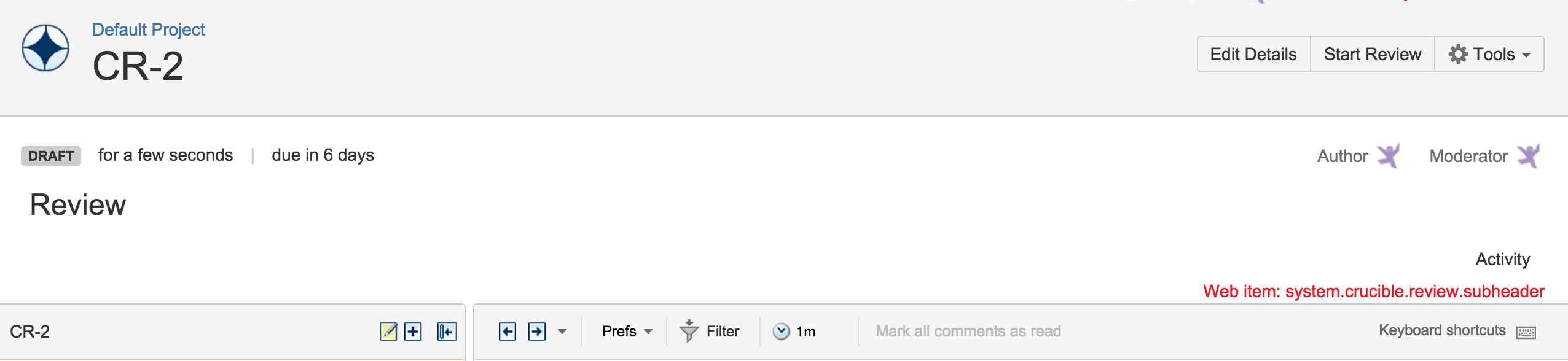 1 2<web-item key="review-activity-button" section="system.crucible.review.subheader"> <label>Activity</label> <styleClass>review-activity-button</styleClass> <param name="data.action-label">Activity</param> <condition class="com.atlassian.fisheye.plugin.web.conditions.HasCrucible"/> </web-item>