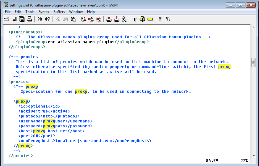 settings.xmlIf you're doing your development behind a corporate firewall, you may need to connect to the Internet through an HTTP proxy. If you know you do not have a firewall, skip this procedure. If you know your company requires you to use an HTTP proxy, you need to configure proxy settings in the ATLAS_HOME/apache-maven/conf/settings.xml file. Do the following: