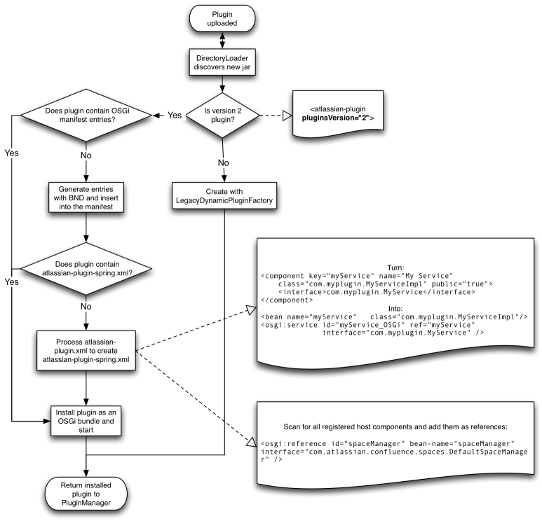 The following diagram describes the process by which a plugin JAR is dynamically loaded and, at the end of the process flow, transformed into an OSGi bundle.