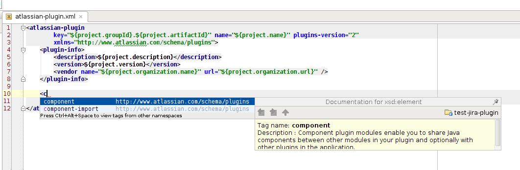 Many IDEs are smart enough to use their code suggestion features with schemas. XML-specific editors like OxygenXML do this, as well as the major Java IDEs. In addition, the schemas contain embedded documentation. The documentation explains which plugin module corresponds to the XML tag, what its acceptable parameters are, what's required and what's not, and so on. The documentation text comes from the plugin module pages on the development hubs for each supported product (see Confluence, JIRA, and the plugin framework).