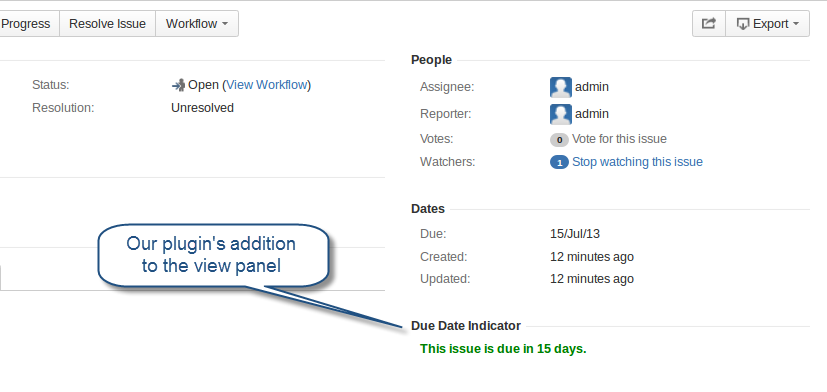 This tutorial shows you how to add content to the View Issue page in Jira. It demonstrates how to create an app that adds a web panel to the page if the issue has a due date. Web panel displays a colorful indication of when an issue is due (or overdue).