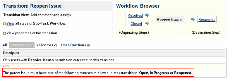 In this example, the condition has been configured to display the workflow transition 'Reopen' for a sub-task, only if the parent issue is associated with an unresolved status (e.g. 'Open', 'In Progress' , Unresolved').