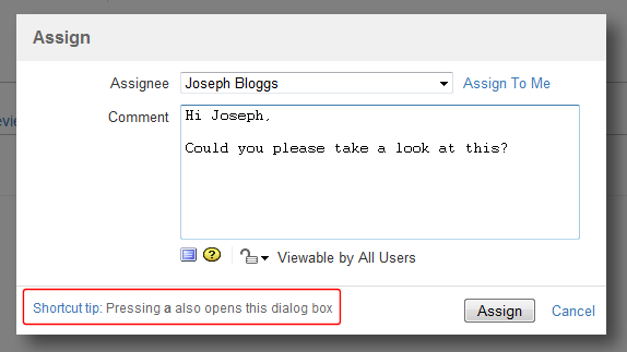 Avoid choosing a keyboard shortcut that is already built in to Jira. For details on Jira's existing keyboard shortcuts, refer to Using Keyboard Shortcuts in the Jira User's Guide.