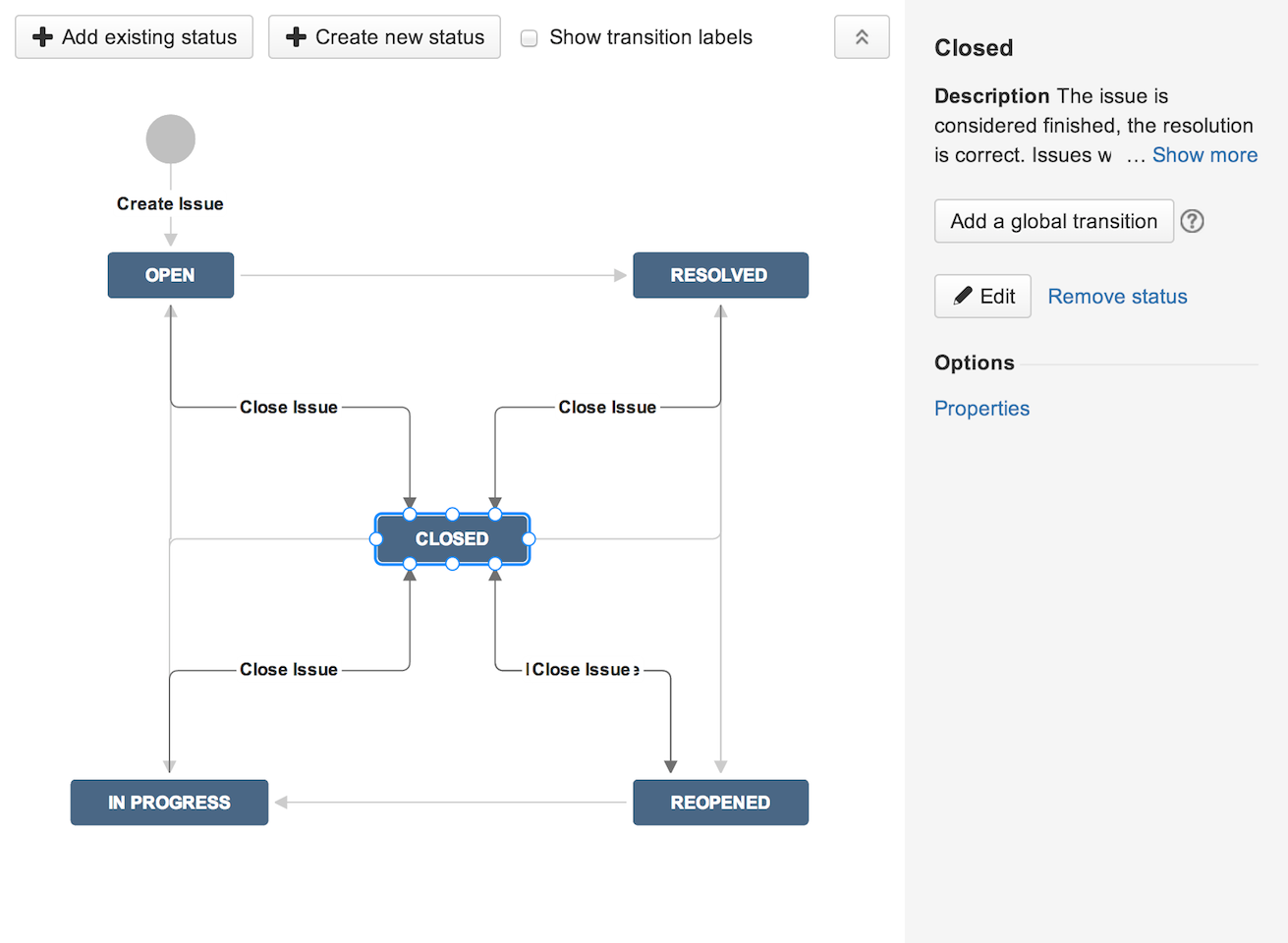 JIRA's workflow designer JavaScript component renders an editable visual representation of a workflow in the browser. Users can add, edit, and remove statuses and transitions, inspect the workflow by panning and zooming, and position elements on the canvas. Changes are periodically saved to the server without prompting the user.