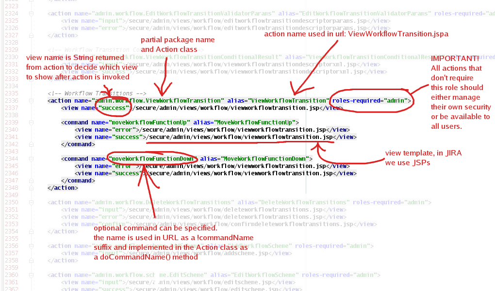 actions.xmlA web application framework defines what happens when you visit a particular URL in a web application. For example, the URL for a simple static page with no dynamic content could end in ".html". A ".jspa" suffix indicates that the URL is referring to a page whose content was created using Java Server Pages (JSP). JSP files are templates that can contain both HTML and commands to create HTML. The commands refer to a Java object and the object's methods are called just as in an ordinary Java program. The mapping of the URL to a Java class in JIRA is done using the Webwork 1.x web application framework. The original documentation for Webwork 1.x can be found at http://opensymphony.com/webwork_old/src/docs/manual and http://wiki.opensymphony.com/display/WW1/Home. However, this framework has been superseded by Webwork 2, which is used by Confluence, Bamboo and Crowd